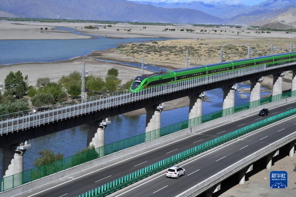 試運(yùn)行的復(fù)興號(hào)列車行駛在雅魯藏布江畔(2021年6月16日攝)。新華社記者 覺(jué)果 攝