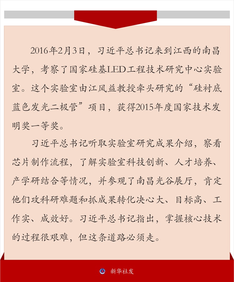 習(xí)近平總書(shū)記聽(tīng)取實(shí)驗(yàn)室研究成果介紹,察看芯片制作流程,了解實(shí)驗(yàn)室科技創(chuàng)新、人才培養(yǎng)、產(chǎn)學(xué)研結(jié)合等情況,并參觀了南昌光谷展廳,肯定他們攻科研難題和抓成果轉(zhuǎn)化決心大、目標(biāo)高、工作實(shí)、成效好。習(xí)近平總書(shū)記指出,掌握核心技術(shù)的過(guò)程很艱難,但這條道路必須走。