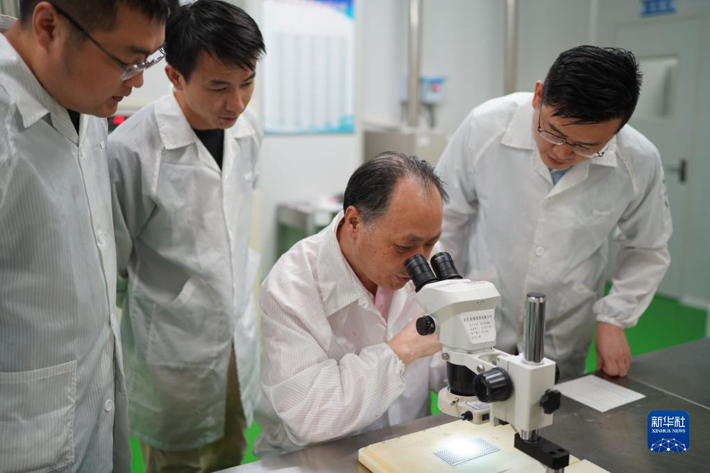 江風(fēng)益在位于南昌高新區(qū)的實(shí)驗(yàn)室內(nèi)與團(tuán)隊(duì)成員一起工作(2022年8月5日攝)。新華社記者 周密 攝