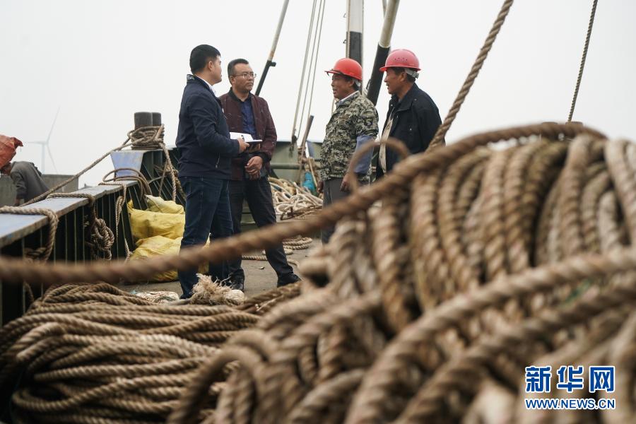 2020年10月21日,江蘇省海安市濱海新區(qū)紀(jì)工委干部(左一、左二)向漁船負責(zé)人詢問惠漁油補發(fā)放情況。 新華社記者 季春鵬 攝