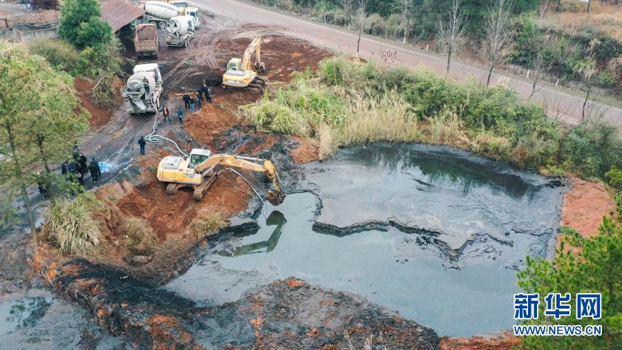 1月7日,在湖南省茶陵縣洣江街道諸睦村和建礦業(yè)有限公司,茶陵縣多部門工作人員在抓緊清理尾礦庫的廢水和淤泥(無人機照片)。 新華社發(fā)