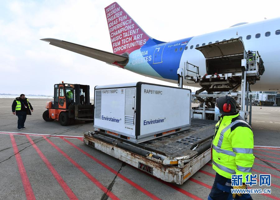 2021年1月16日,在塞爾維亞首都貝爾格萊德,機(jī)場(chǎng)工作人員卸載首批由中國國藥集團(tuán)生產(chǎn)的新冠疫苗。新華社發(fā)(普雷德拉格·米洛薩夫列維奇攝)