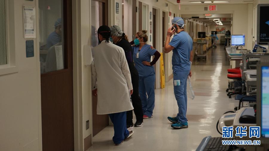 2021年1月22日,在美國加利福尼亞州蒙特貝洛市貝弗利醫(yī)院,醫(yī)護(hù)人員在“新冠病區(qū)”工作。由于新冠確診病例激增,南加州地區(qū)醫(yī)院的重癥監(jiān)護(hù)室空置率為零。新華社發(fā)(曾慧攝)
