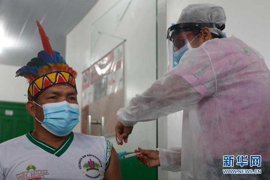 2021年1月19日,在巴西亞馬孫州塔巴廷加市,醫(yī)護(hù)人員為一名原住民接種中國新冠疫苗。新華社發(fā)(盧西奧·塔沃拉 攝)