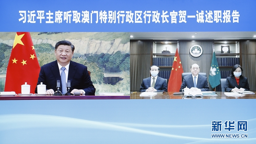 1月27日,國家主席習(xí)近平在北京以視頻連線方式聽取了澳門特別行政區(qū)行政長官賀一誠2020年度的述職報告。新華社記者 王曄 攝