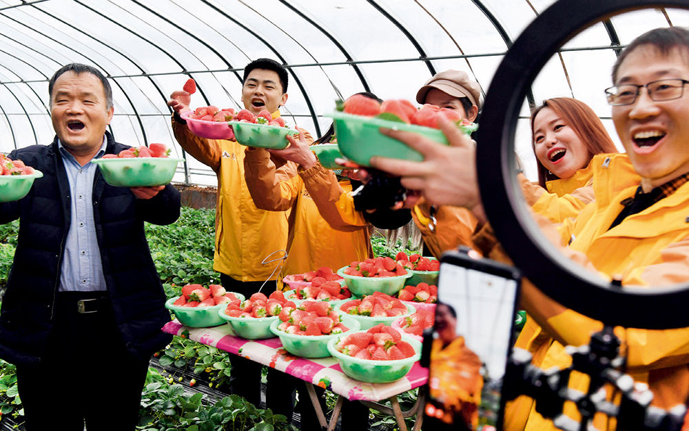 ▲ 一家電商平臺(tái)工作人員在陜西省合陽(yáng)縣金峪鎮(zhèn)溝北現(xiàn)代農(nóng)業(yè)科技示范區(qū)直播推廣草莓(2020年1月10日攝) 陶明攝