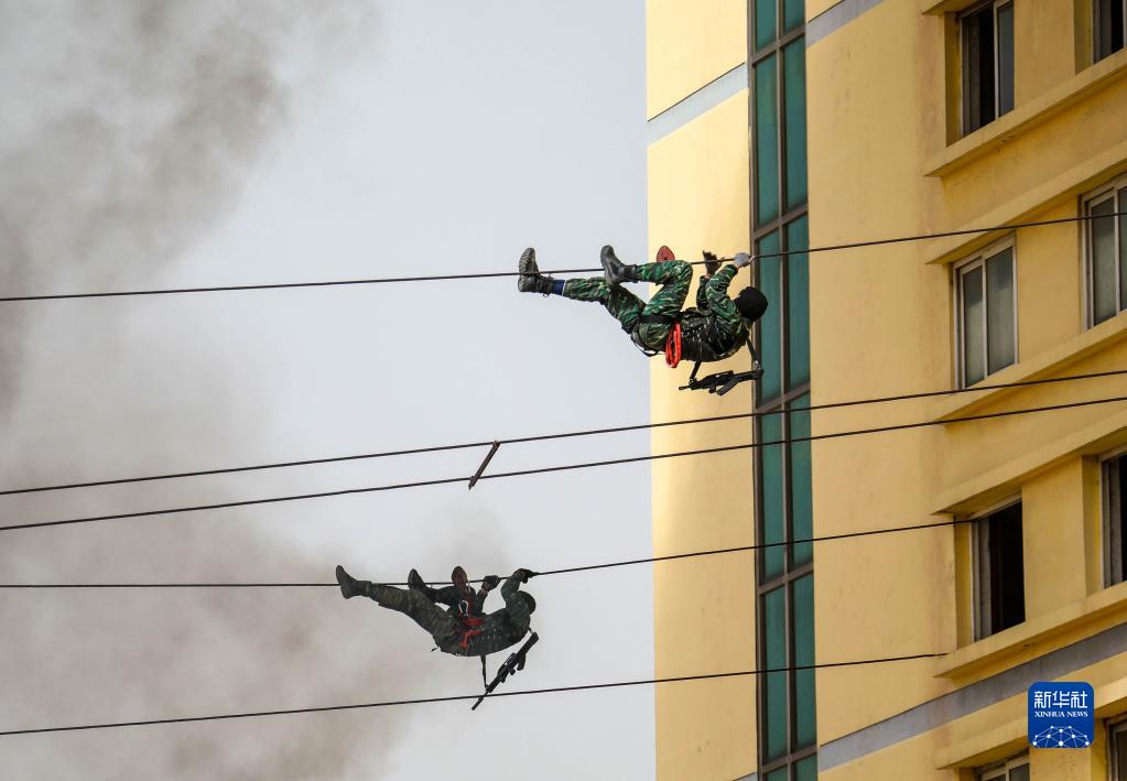 在模擬反恐演練中,武警獵鷹突擊隊特戰(zhàn)隊員利用鐵索接近被“恐怖分子”占據(jù)的樓房(2019年4月4日攝)。新華社發(fā)(楊志毅 攝)