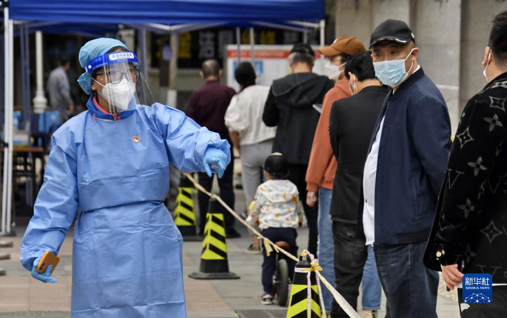 共產(chǎn)黨員、北京八里莊街道機(jī)關(guān)干部張茜(左)在核酸篩查現(xiàn)場進(jìn)行秩序維護(hù)(2022年5月11日攝)。新華社記者 李欣 攝