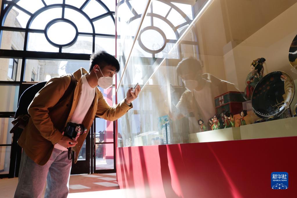 10月10日,觀眾在“奮進新時代”主題成就展第五單元“堅定文化自信 建設(shè)社會主義文化強國”展廳拍攝展示代表性非遺作品和文創(chuàng)精品的博古架。新華社記者 張玉薇 攝
