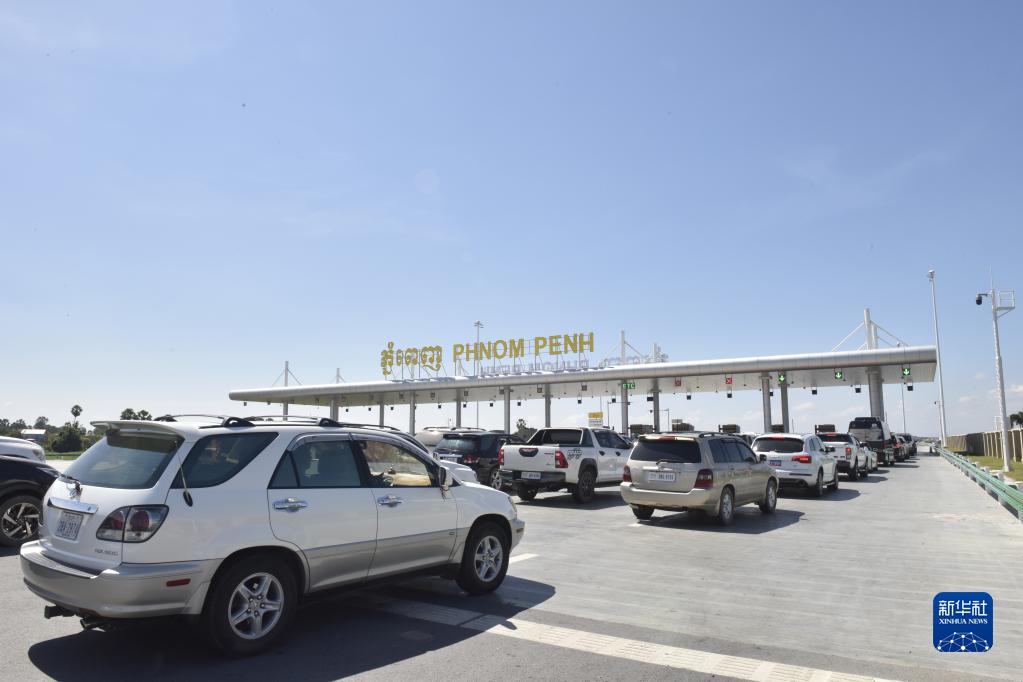 車輛在柬埔寨首都金邊的金港高速公路入口處排隊(duì)(2022年11月7日攝)。新華社記者 吳長偉 攝