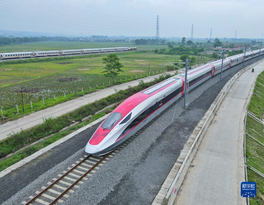 在印度尼西亞西爪哇省萬隆市,一列高鐵動(dòng)車組正在雅萬高鐵試驗(yàn)段進(jìn)行熱滑試驗(yàn)(2022年11月9日攝,無人機(jī)照片)。新華社發(fā)(李培養(yǎng)攝)