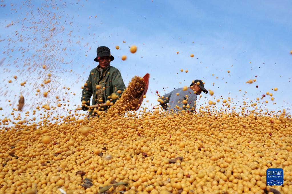 2022年10月20日,在北大荒農(nóng)墾集團(tuán)有限公司北安分公司趙光農(nóng)場(chǎng)有限公司,工作人員在一處曬場(chǎng)的大豆堆上忙碌。新華社記者 王建威 攝