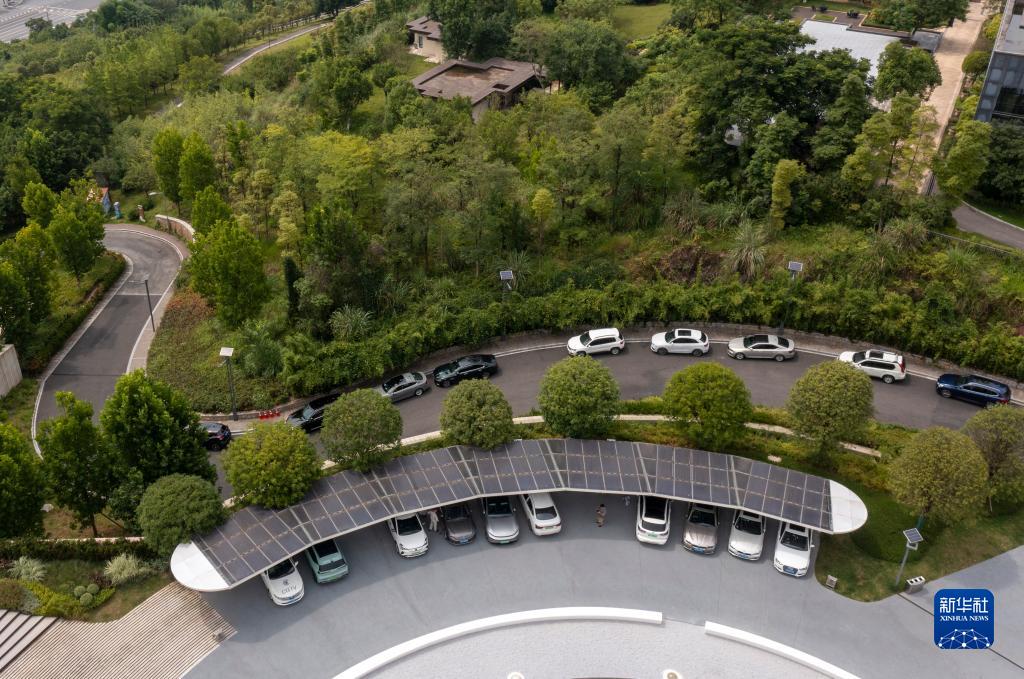 2022年6月16日拍攝的已建成投用的重慶首座光伏充電發(fā)用一體充電站(無(wú)人機(jī)照片)。新華社記者 劉潺 攝