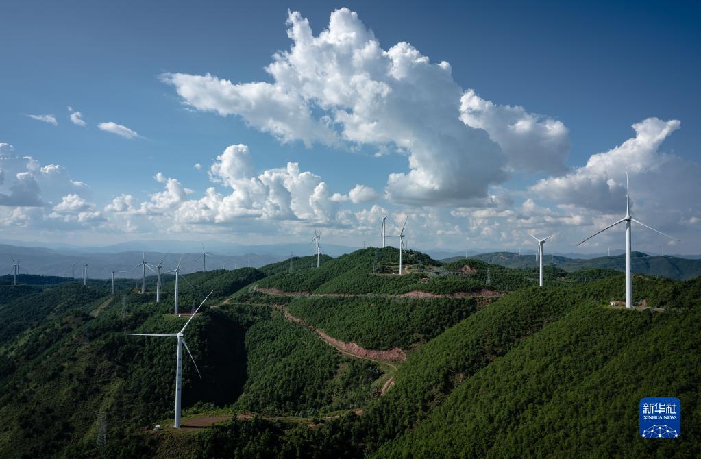 這是2022年8月18日在云南省楚雄彝族自治州姚安縣內(nèi)拍攝的風(fēng)力發(fā)電機(jī)。新華社記者 王冠森 攝