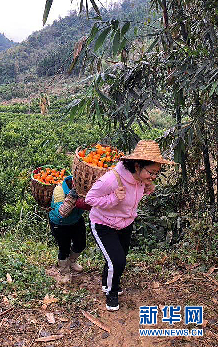 黃文秀與村民一起采摘運輸砂糖橘(資料照片)。新華社發(fā)