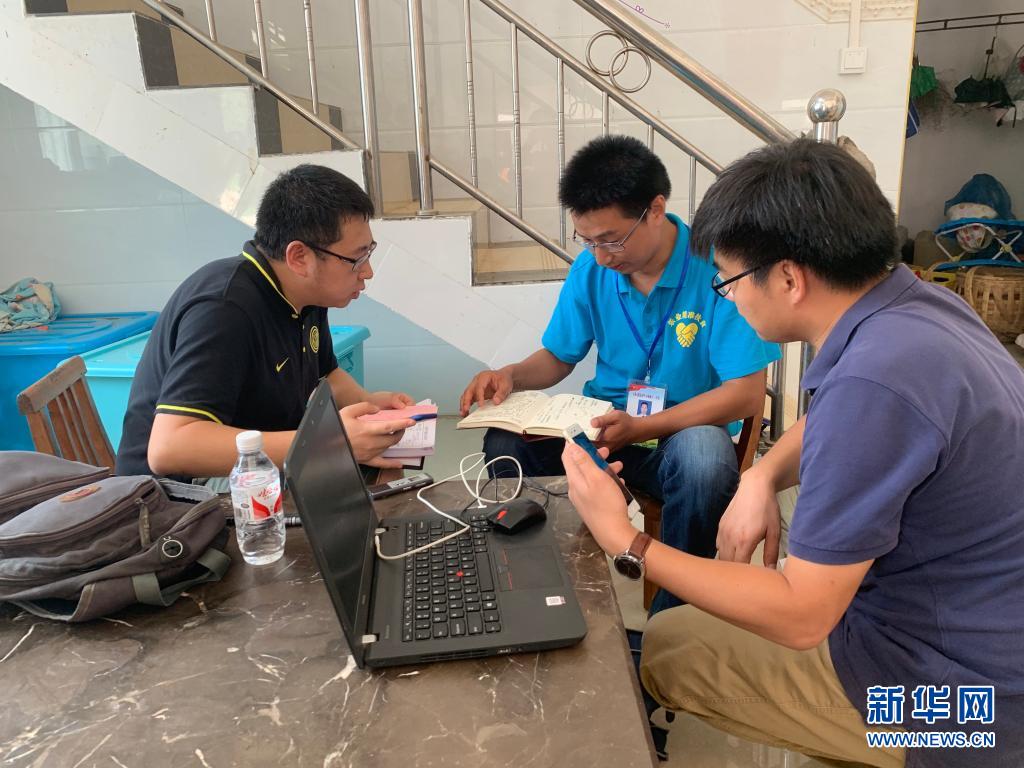 記者何偉(右一)與同事采訪廣西百色市樂業(yè)縣百坭村新任駐村第一書記楊杰興(中)(2019年7月31日攝)。新華社記者 徐海濤 攝
