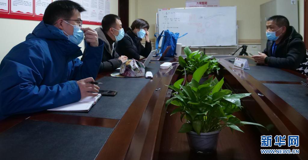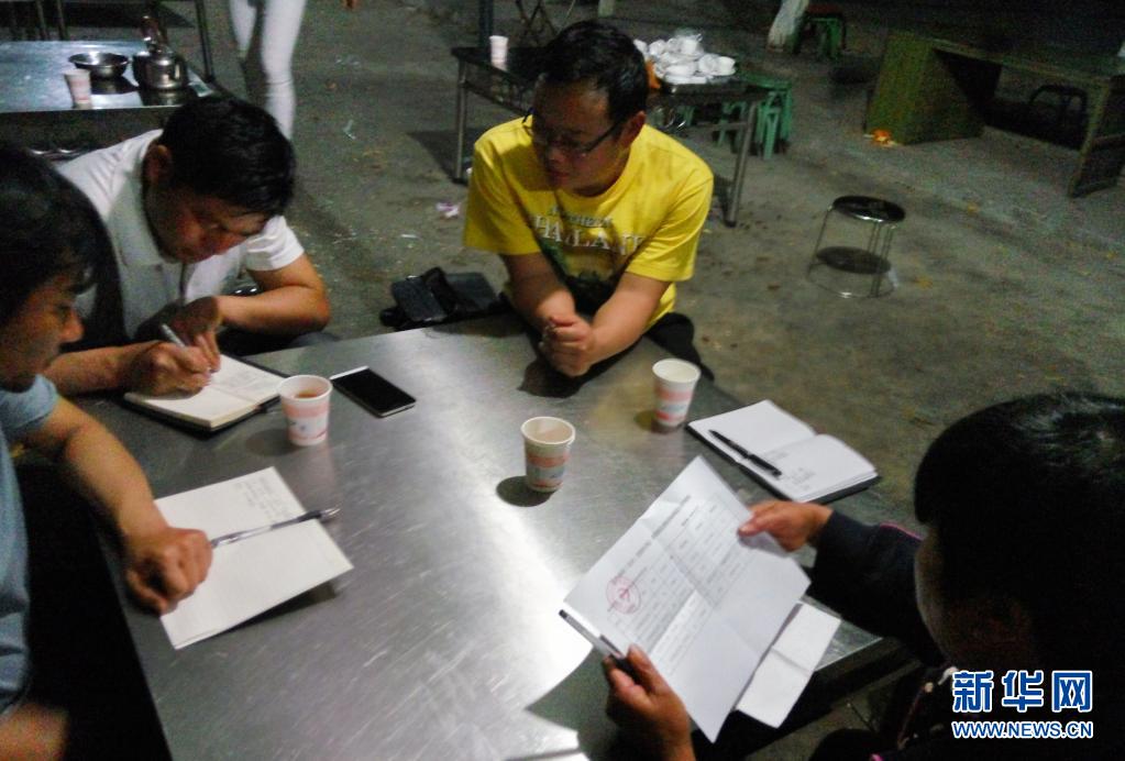 吳國良(右二)與扶貧干部交流工作進展(資料照片)。新華社發(fā)