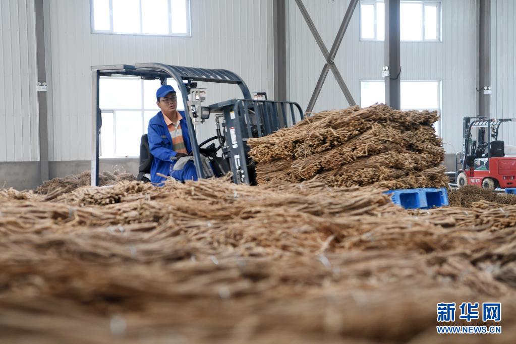 在甘肅省隴南市宕昌縣哈達鋪琦昆現(xiàn)代中藥材倉儲物流基地,工作人員使用叉車搬運中藥材(2020年9月18日攝)。新華社記者 范培珅 攝