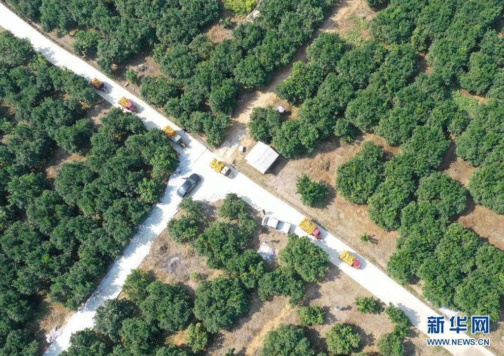 在廣西羅城仫佬族自治縣金玉柚生態(tài)產(chǎn)業(yè)扶貧示范區(qū),裝載柚子的車輛在柚子園內(nèi)行駛(2019年11月5日攝,無人機照片)。新華社記者 陸波岸 攝