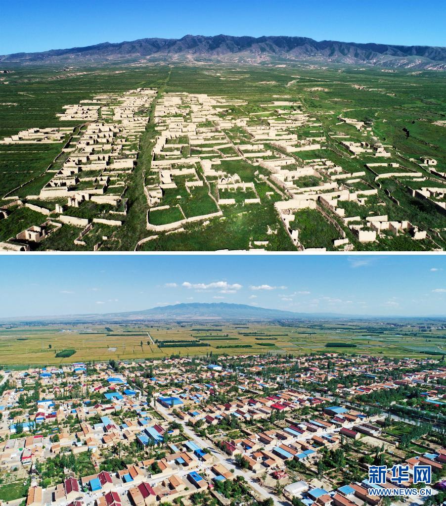 這是一張拼版照片,上圖為:經(jīng)過多年的生態(tài)修復(fù),寧夏吳忠市紅寺堡區(qū)新莊集鄉(xiāng)的移民舊址已逐漸被綠色覆蓋;下圖為:戈壁荒灘上建起的紅寺堡移民新村(2018年9月8日攝,無人機照片)。新華社記者 王鵬 攝