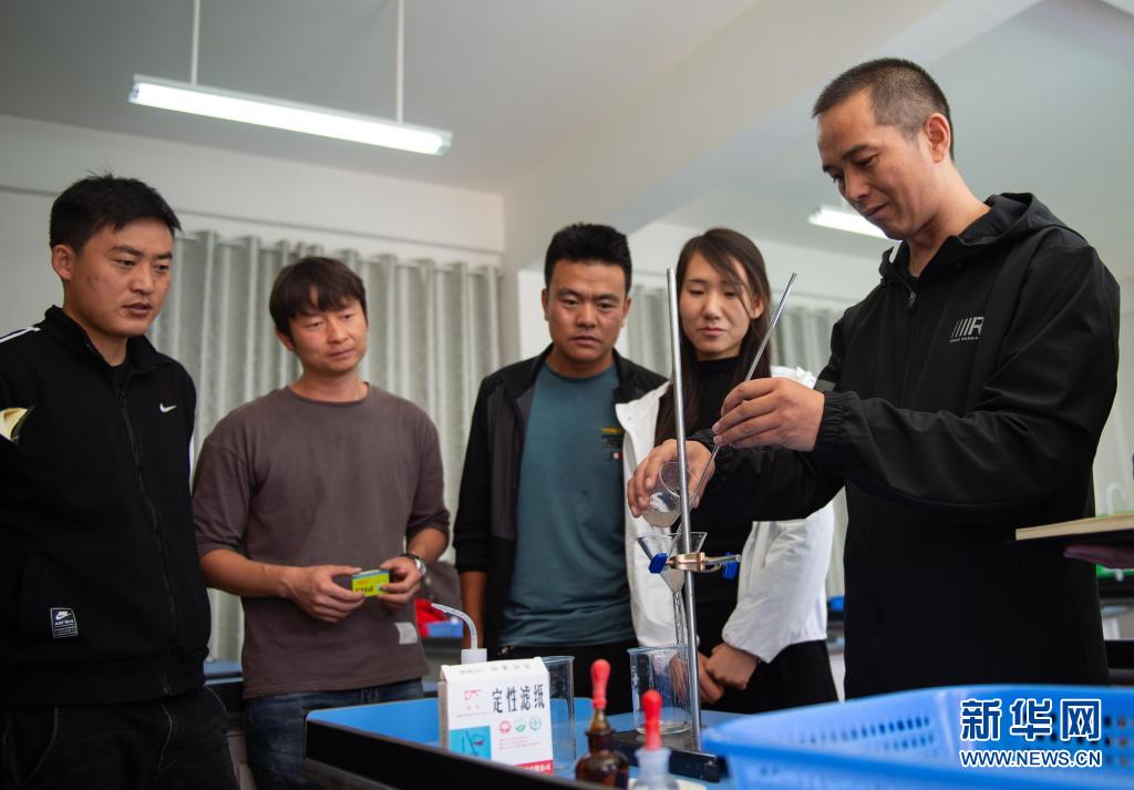 北京市援青支教教師、來自通州區(qū)陸辛莊學(xué)校的化學(xué)教師祁生貴(右一)在青海省玉樹州第四民族高級中學(xué)指導(dǎo)學(xué)校教師進行實驗教學(xué)(2020年8月12日攝)。新華社記者 陳鐘昊 攝