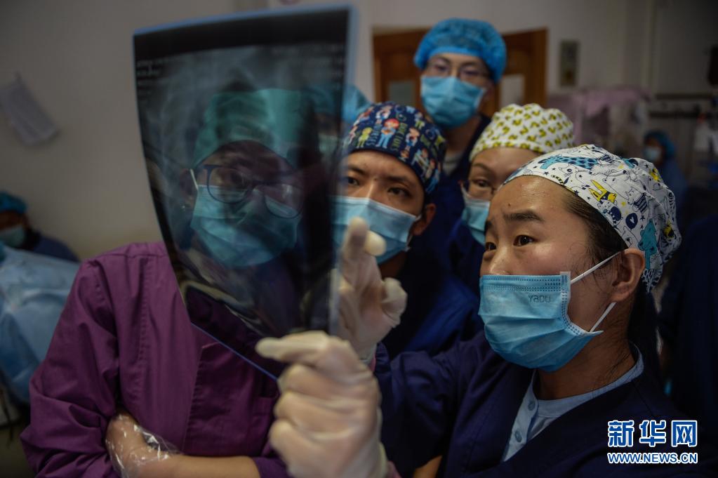 在西藏拉薩市人民醫(yī)院內(nèi),首都兒科研究所的援藏醫(yī)生韓同英(右一)進行教學(xué)查房時,與當(dāng)?shù)蒯t(yī)生們一起研究入院新生兒胸片(2020年8月3日攝)。新華社記者 彭子洋 攝