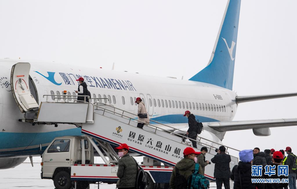 在寧夏固原六盤山機場,固原市原州區(qū)、西吉縣的務(wù)工人員乘包機前往福建(2020年2月27日攝)。新華社記者 馮開華 攝