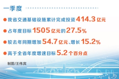 這是我省全力推動(dòng)交通重點(diǎn)項(xiàng)目建設(shè)加速提質(zhì)增效的一個(gè)縮影。記者從當(dāng)天召開的河南省交通運(yùn)輸經(jīng)濟(jì)運(yùn)行調(diào)度會(huì)上獲悉,今年一季度,我省交通基礎(chǔ)設(shè)施累計(jì)完成投資414.3億元,占年度目標(biāo)1505億元的27.5%,較去年同期增加54.7億元、增長(zhǎng)15.2%,高于全省年度增速目標(biāo)5.2個(gè)百分點(diǎn)。