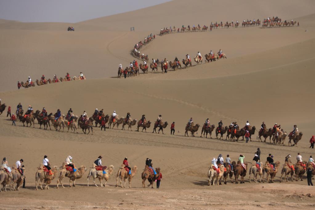 “2400多峰駱駝全部‘上崗’,從早到晚忙不過來!原本40分鐘的路程現(xiàn)在要走1小時左右?!倍鼗网Q沙山月牙泉景區(qū)負(fù)責(zé)人說。