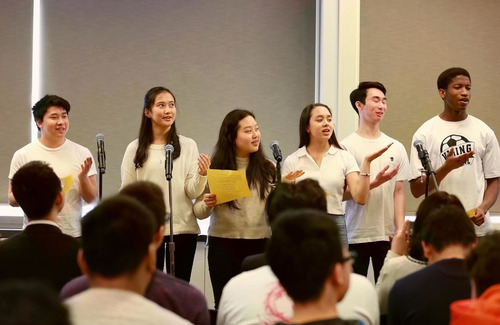 2019年4月3日,在美國(guó)伊利諾伊州北奈爾斯市,北奈爾斯高中的學(xué)生們現(xiàn)場(chǎng)中文朗誦唐代詩人李白的《靜夜思》和孟浩然的《春曉》。
