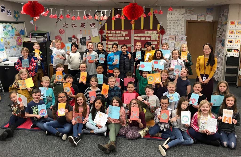 2020年1月21日,在美國(guó)猶他州奧勒姆,卡斯卡德小學(xué)師生展示為習(xí)主席制作的新年賀卡。