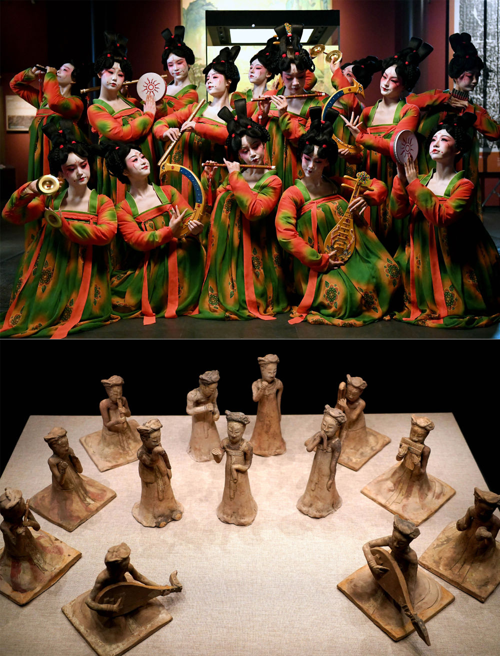 這是一張拼版照片:上圖為鄭州歌舞劇院的演員在錄制河南博物院元宵奇妙夜節(jié)目(2021年2月20日攝);下圖為河南博物院主展館內展出的展品(2020年9月24日攝)。新華社記者 李安 攝