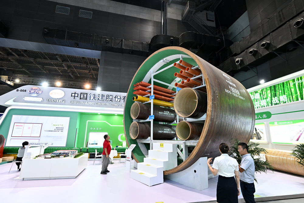 9月2日,在國(guó)家體育館舉行的服貿(mào)會(huì)環(huán)境服務(wù)專題展上,客商在中國(guó)鐵建展位竹纏繞管廊旁了解信息。新華社記者 李鑫 攝