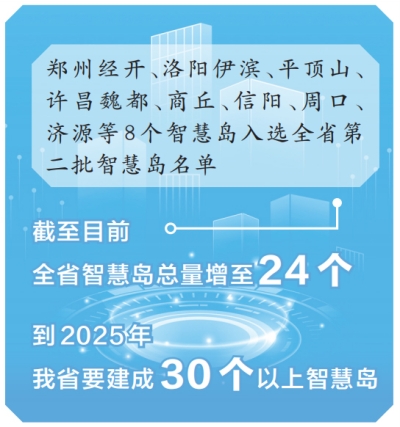 ??11月8日,記者獲悉,省人民政府辦公廳日前公布全省第二批智慧島名單,鄭州經(jīng)開、洛陽伊濱、平頂山、許昌魏都、商丘、信陽、周口、濟(jì)源等8個(gè)智慧島入選。截至目前,全省智慧島總量增至24個(gè)。