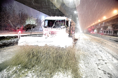 ??12月11日深夜兩點(diǎn),鄭州市公用集團(tuán)出動(dòng)鏟雪車在北三環(huán)立交下除雪 正觀新聞·鄭州晚報(bào)記者 周甬 圖