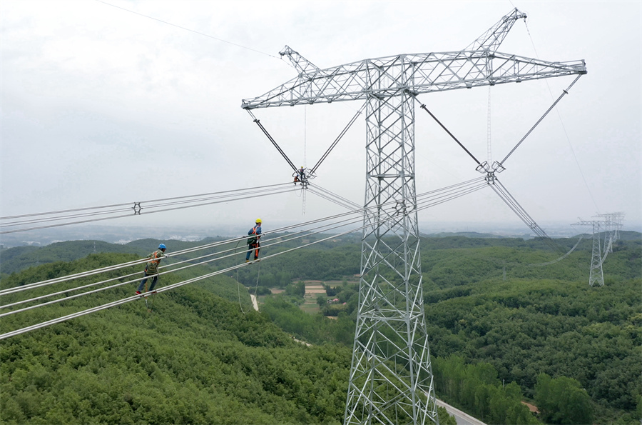 ??國(guó)網(wǎng)河南省電力公司員工在±800千伏青豫特高壓工程西陜段進(jìn)行線路檢修。