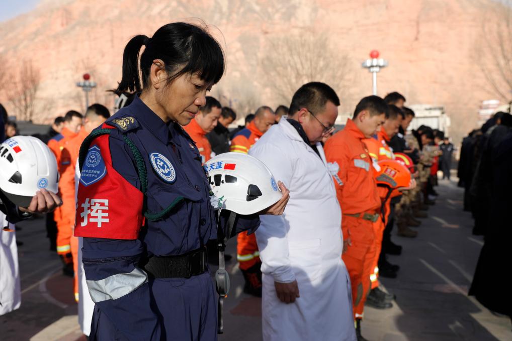 12月25日,在積石山縣大河家鎮(zhèn)大河文化廣場,參加悼念活動的人員為遇難同胞默哀。 新華社記者 方欣 攝