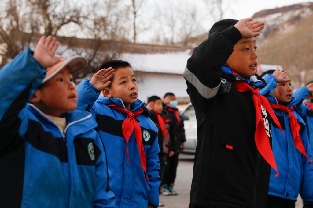 12月25日,積石山縣柳溝鄉(xiāng)陽山希望小學(xué)的學(xué)生在復(fù)課首日舉行升旗儀式。 新華社記者 方欣 攝