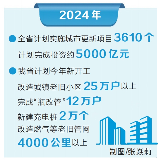 聚焦群眾“急難愁盼”等突出問題,我省堅持項目為王,科學(xué)謀劃實施城市更新項目。針對“一主兩副”重點城市和城市生命線安全工程、老舊小區(qū)改造、地下管網(wǎng)改造等重點領(lǐng)域,完善城市更新項目庫,強化項目監(jiān)測調(diào)度,穩(wěn)步推動項目落地見效。我省計劃今年新開工改造城鎮(zhèn)老舊小區(qū)25萬戶以上、完成“瓶改管”12萬戶、新建充電樁2萬個,改造燃氣等老舊管網(wǎng)4000公里以上。