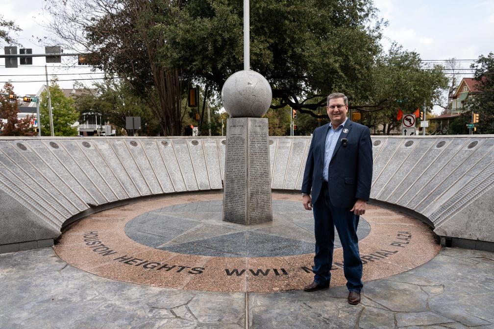 ??2023年12月8日,美國休斯敦市區(qū)的二戰(zhàn)紀(jì)念廣場,杜立特突襲者子女協(xié)會負(fù)責(zé)人戴維·坎滕伯格在紀(jì)念碑前接受新華社記者采訪。