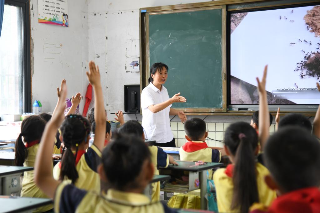 ??5月31日,學(xué)生在科學(xué)課上與老師互動(dòng)。新華社記者 胥冰潔 攝