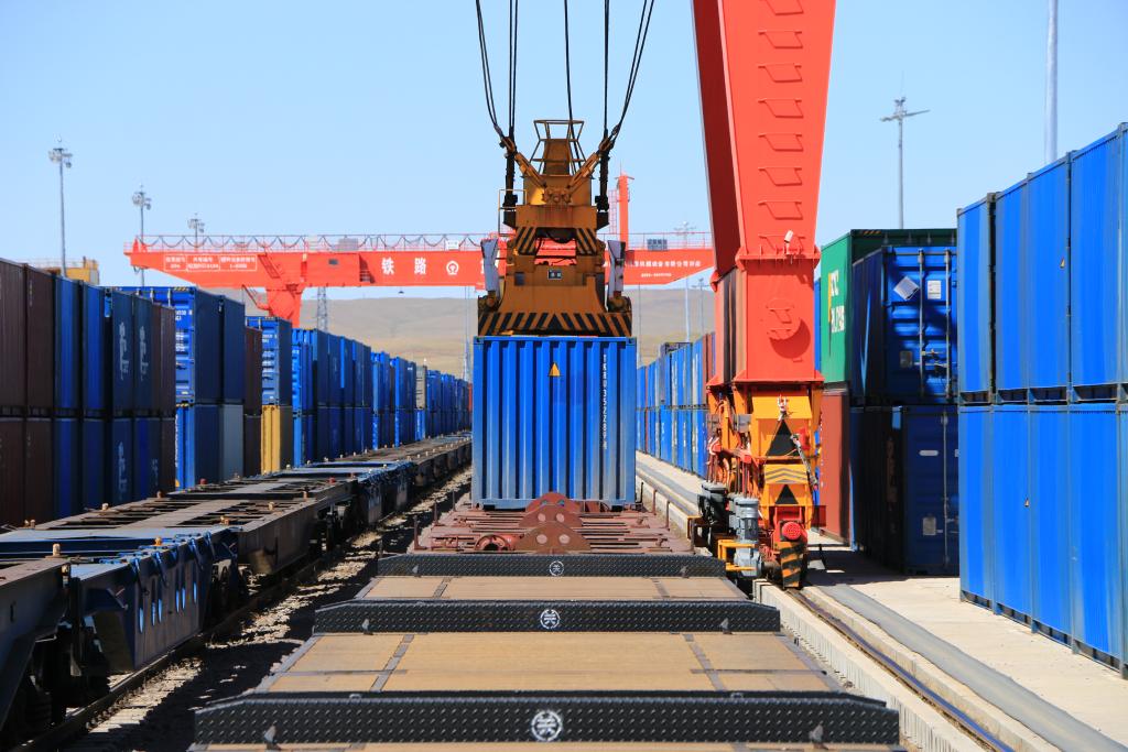 ??5月15日,中國(guó)鐵路哈爾濱局集團(tuán)有限公司滿洲里站貨運(yùn)車間集裝箱場(chǎng)在對(duì)中歐班列進(jìn)行換裝作業(yè)。新華社發(fā)(黃旭攝)