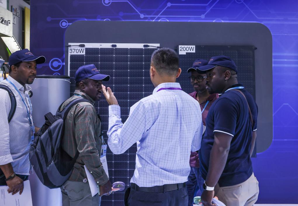 ??4月15日,參展商在第135屆廣交會(huì)上向采購(gòu)商介紹太陽(yáng)能電池組件展品。新華社記者 劉大偉 攝