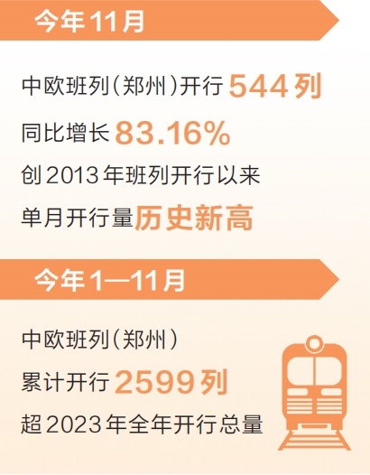 12月2日,記者獲悉,今年11月,中豫港務(wù)集團鄭州陸港公司開行中歐班列(鄭州)544列,同比增長83.16%,創(chuàng)2013年班列開行以來單月開行量歷史新高。中歐班列(鄭州)今年1—11月累計開行2599列,超2023年全年開行總量。
