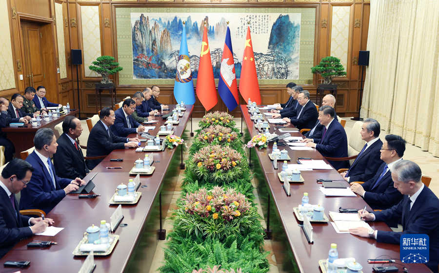 ??習近平指出,當前,國際形勢變亂交織,全球性挑戰(zhàn)層出不窮,考驗著各國的應對和選擇。中柬兩國都致力于做世界的和平力量、發(fā)展力量、進步力量。中方將繼續(xù)支持柬埔寨在國際和地區(qū)事務中發(fā)揮更大作用,壯大“全球南方”力量,支持東盟堅持戰(zhàn)略自主,維護中心地位,堅決反對外部勢力將冷戰(zhàn)思維引入本地區(qū),堅定不移推動東盟一體化和共同體建設。中方愿同柬方堅定道不改、志不變的決心,增強底線思維,加強協(xié)作和配合,共同應對各種風險。