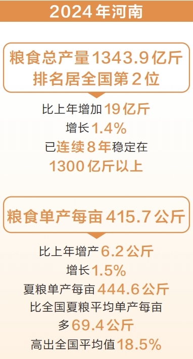 ??12月15日,記者獲悉,根據(jù)國(guó)家統(tǒng)計(jì)局河南調(diào)查總隊(duì)夏糧、秋糧產(chǎn)量抽樣調(diào)查樣本實(shí)割實(shí)測(cè)和糧食播種面積遙感監(jiān)測(cè)結(jié)果,經(jīng)國(guó)家統(tǒng)計(jì)局核定,2024年河南糧食總產(chǎn)量1343.9億斤,排名居全國(guó)第2位。河南糧食總產(chǎn)量已連續(xù)8年穩(wěn)定在1300億斤以上,為鞏固和增強(qiáng)經(jīng)濟(jì)回升向好態(tài)勢(shì)、推動(dòng)高質(zhì)量發(fā)展提供了有力支撐。