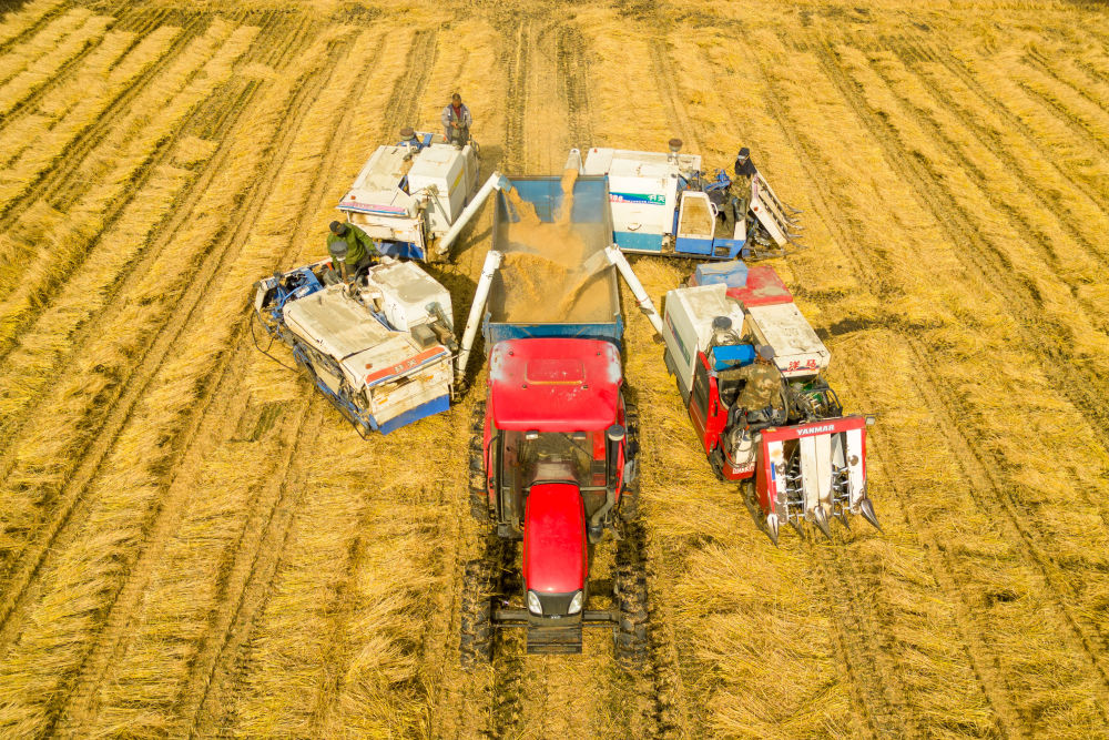 ??在黑龍江省綏化市北林區(qū)雙河鎮(zhèn),村民駕駛收割機進行卸糧作業(yè)(2024年10月13日攝,無人機照片)。新華社記者 張濤 攝